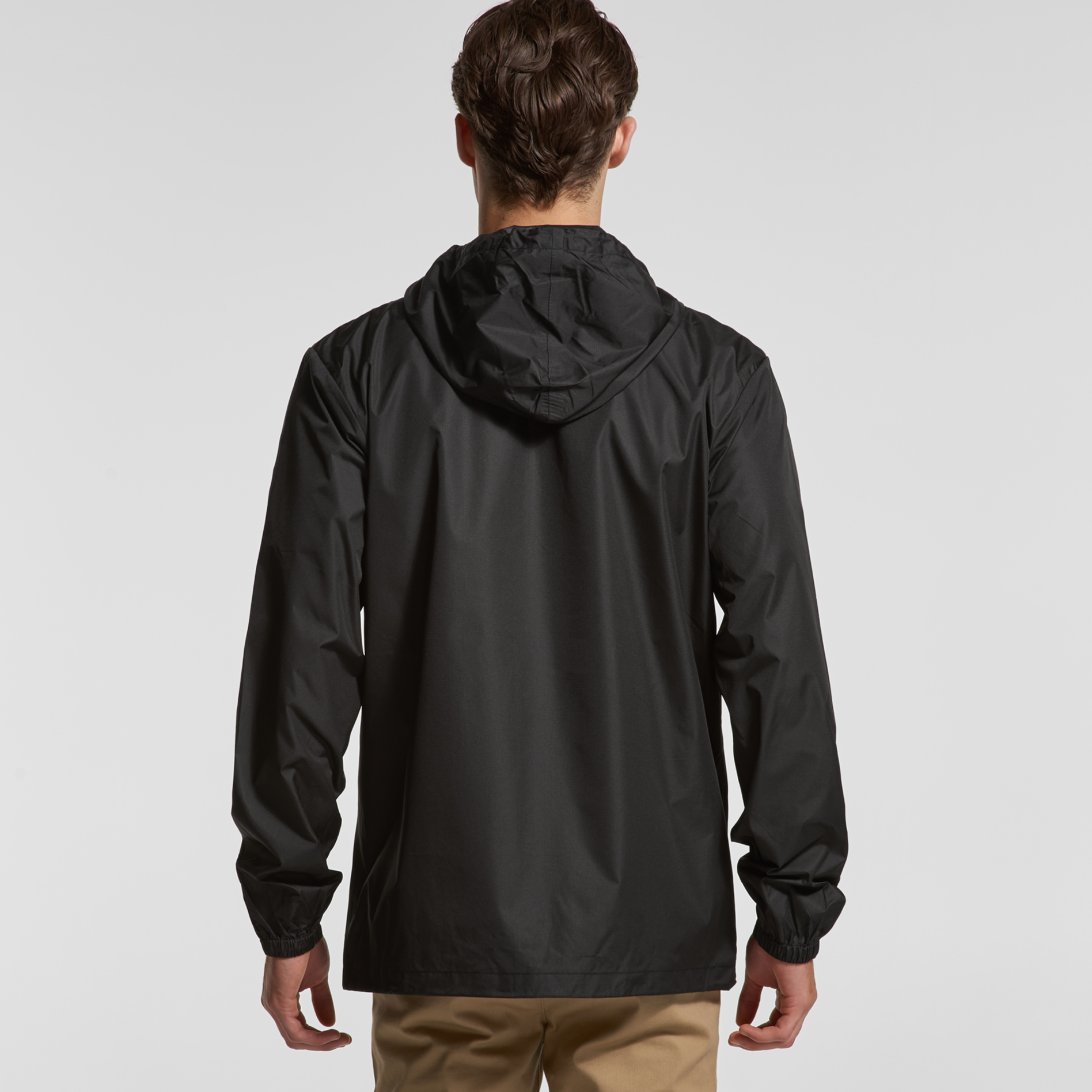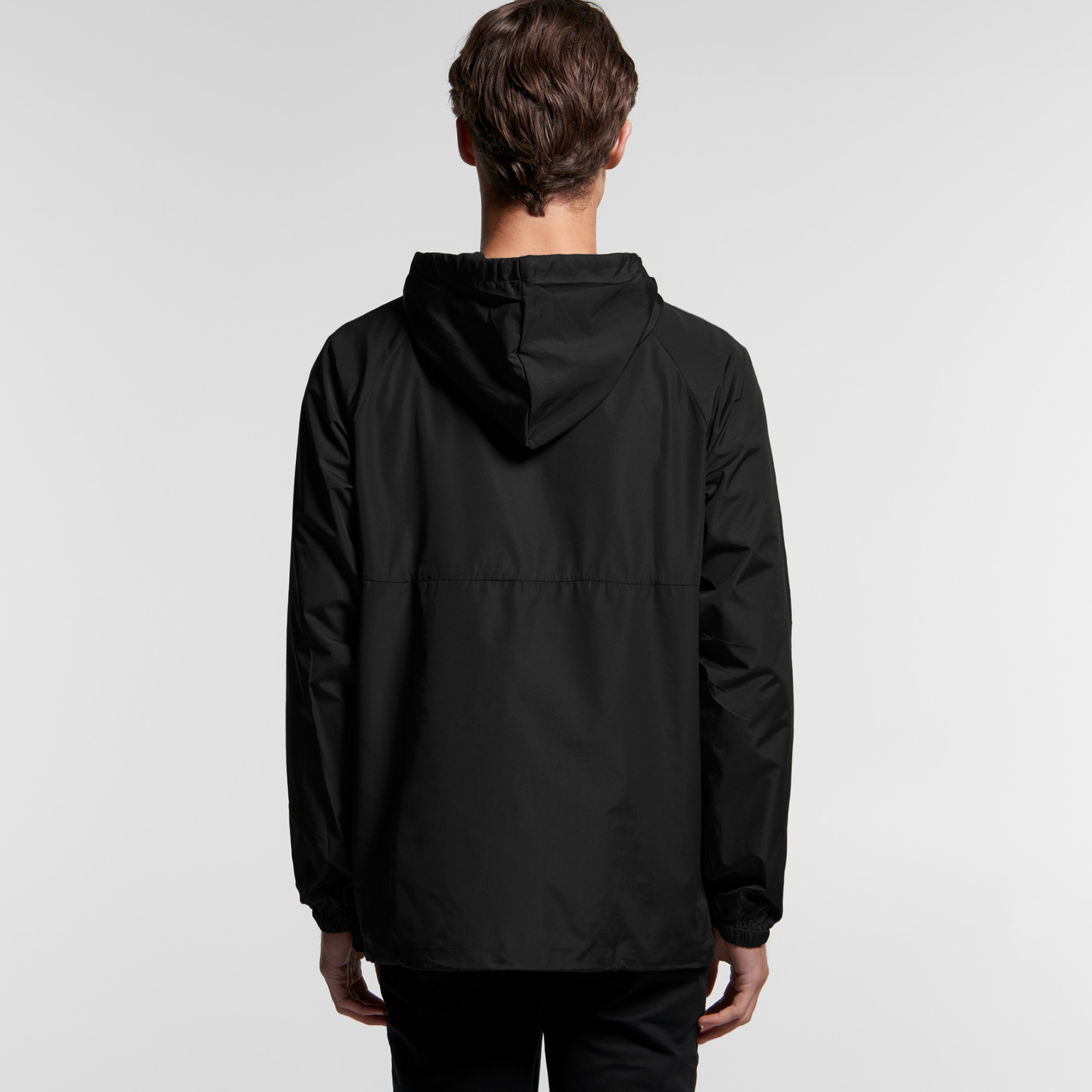 Adjustable elastic drawcords at hem and hood, rubber headphone patch, sealed seams, water resistant, SPF 40, packable