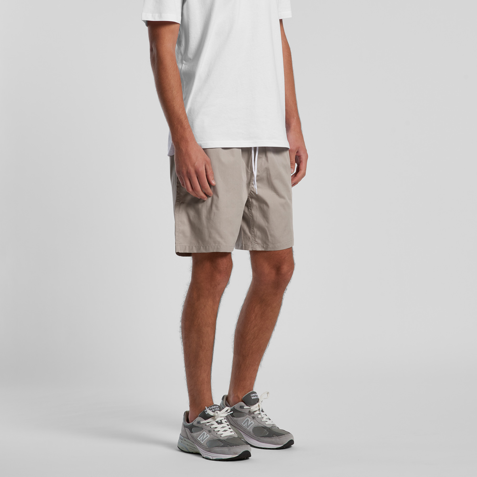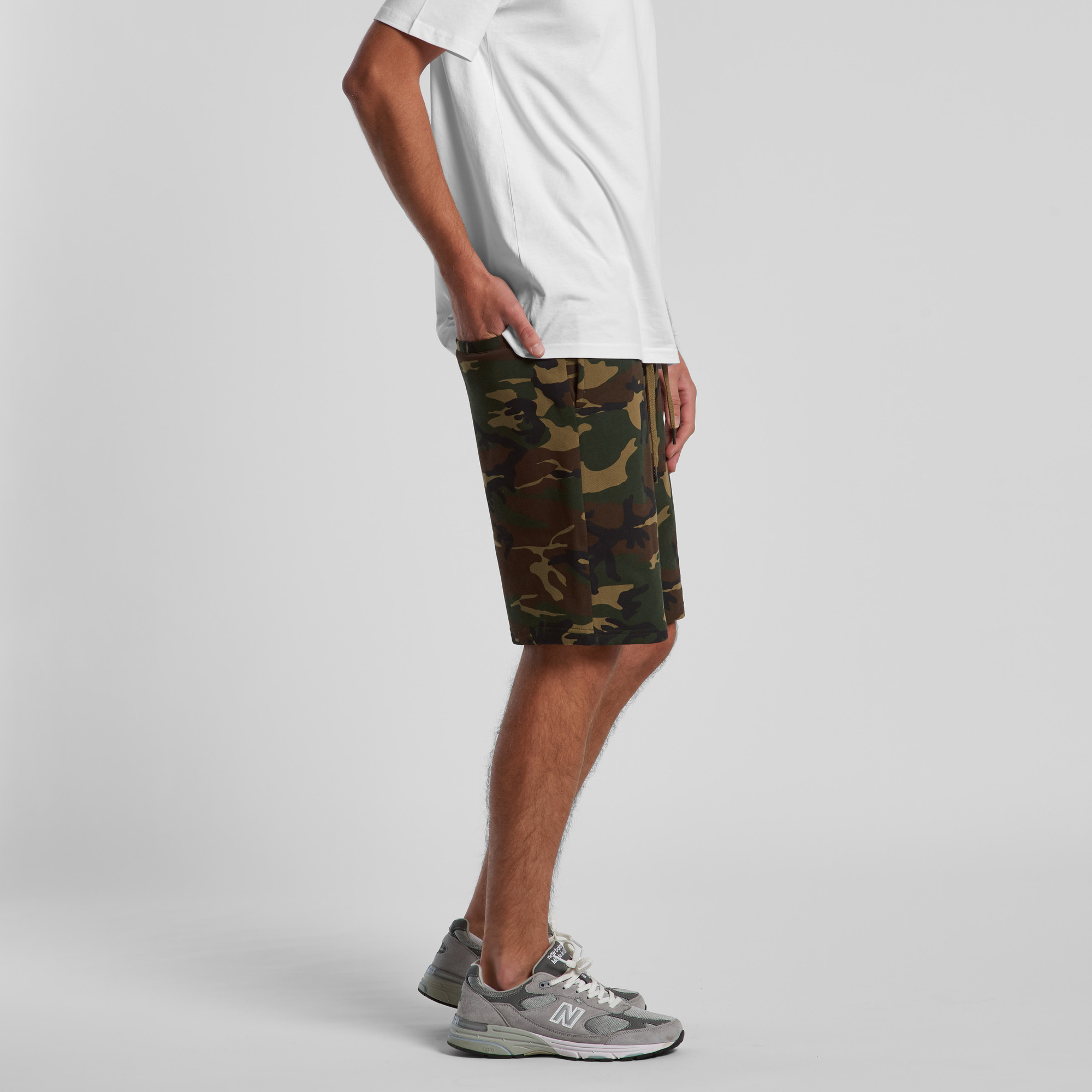 Sweat Shorts, self-fabric elasticated waistband, tonal internal drawcord, 2 side pockets, single pocket at back, double needle hems